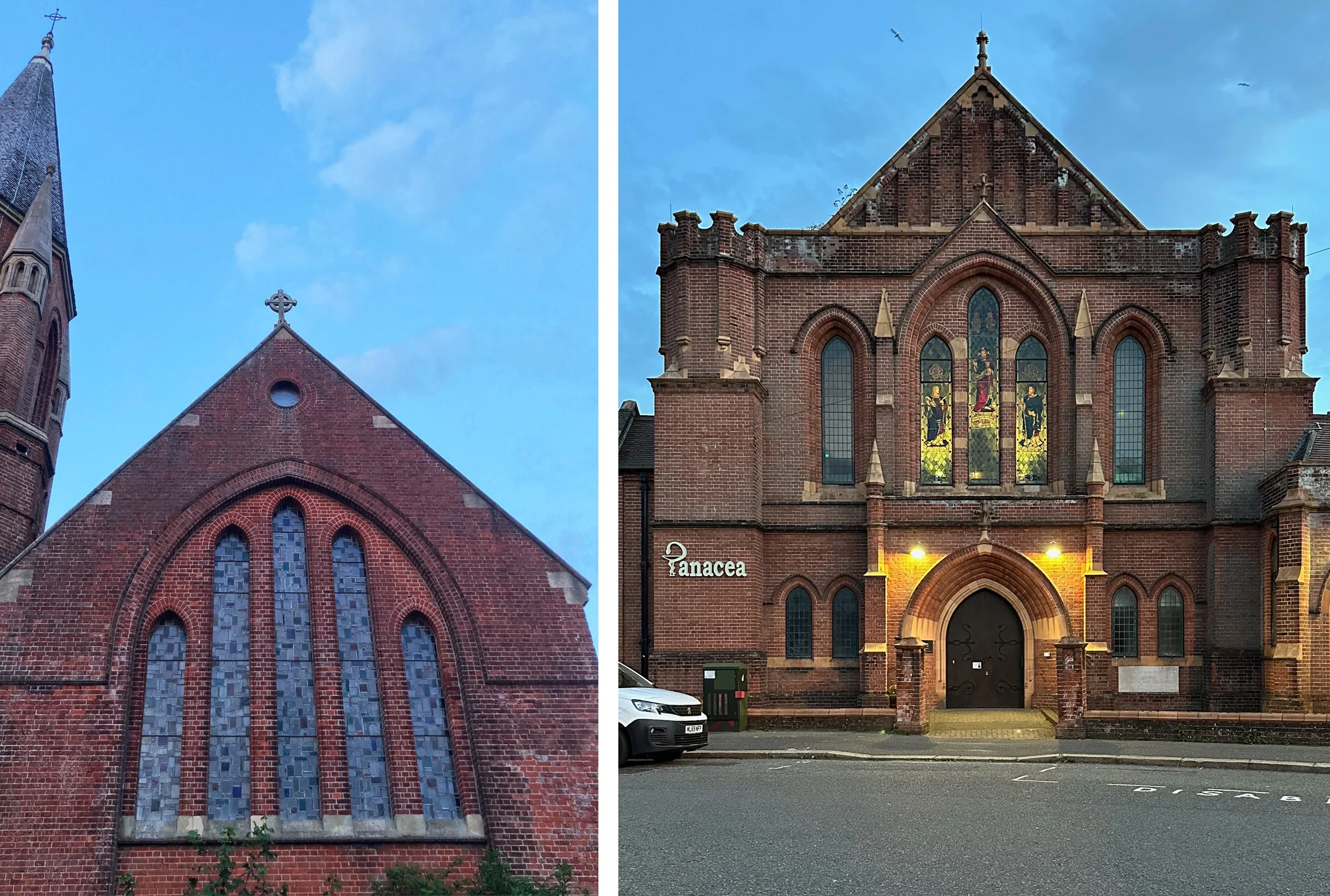 Left: Holy Trinity Church, Right: Panacea Medical Centre, formerly United Reformed Church.