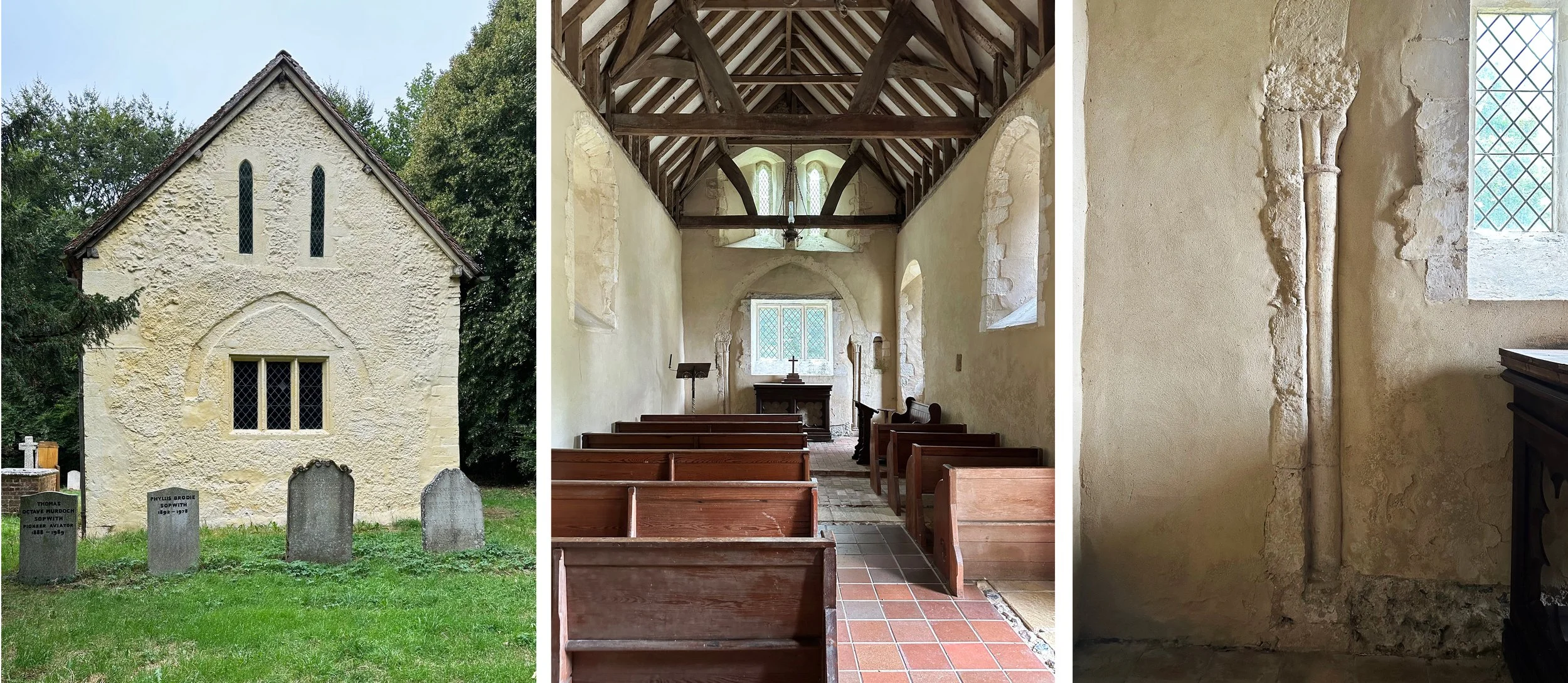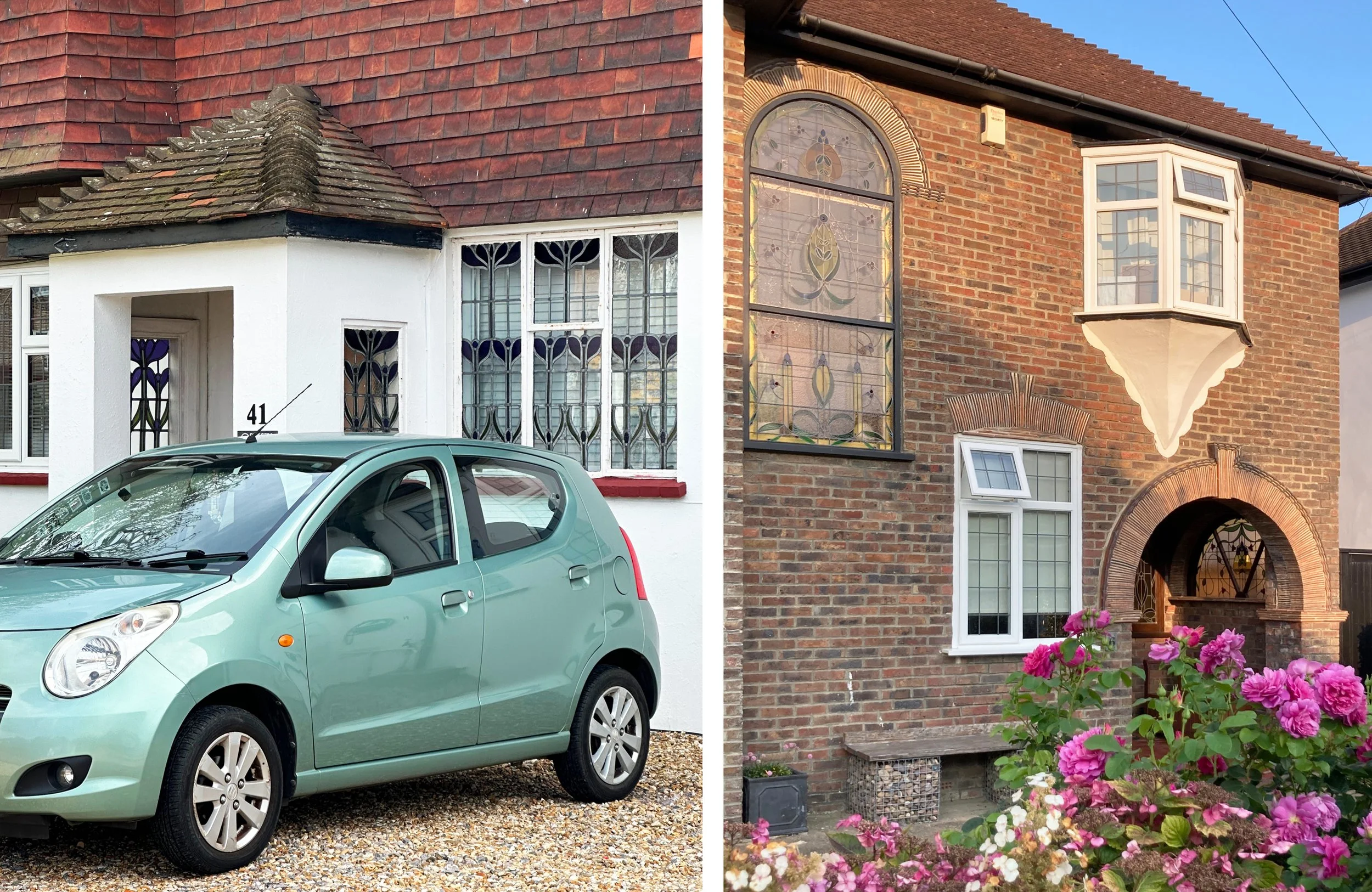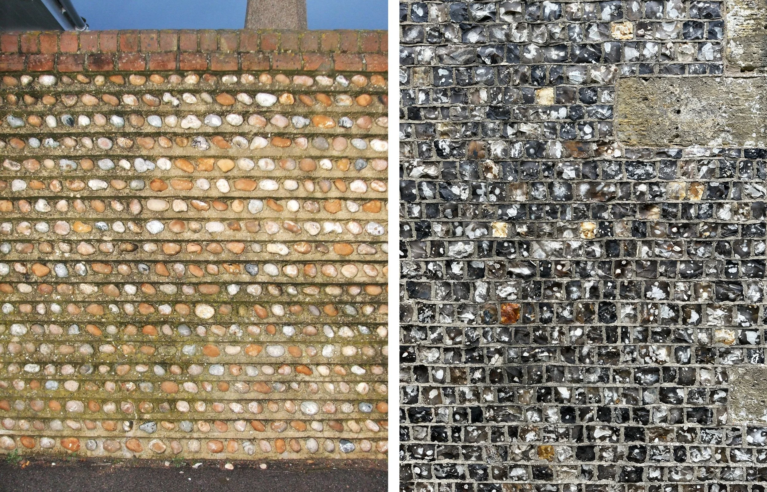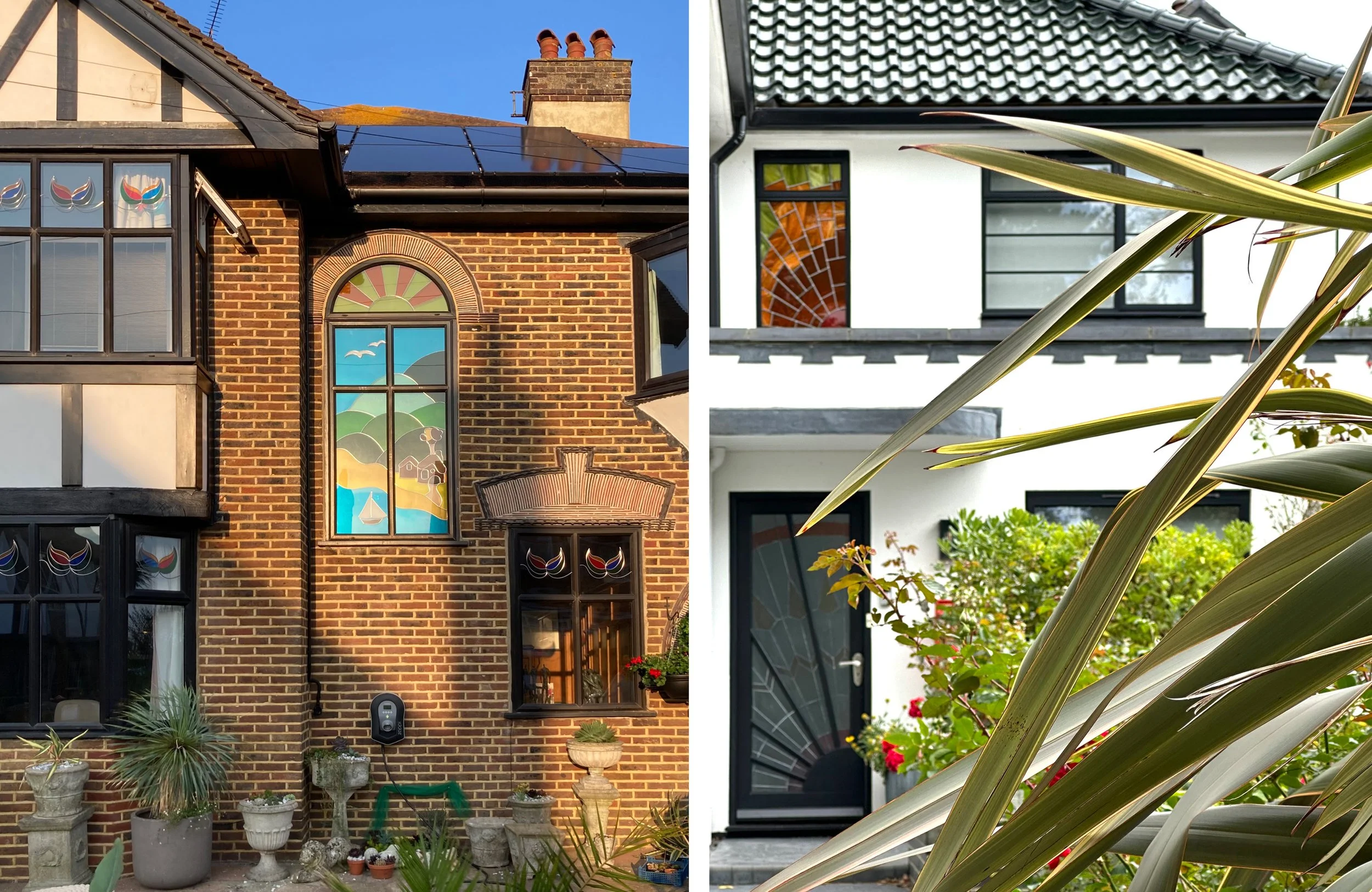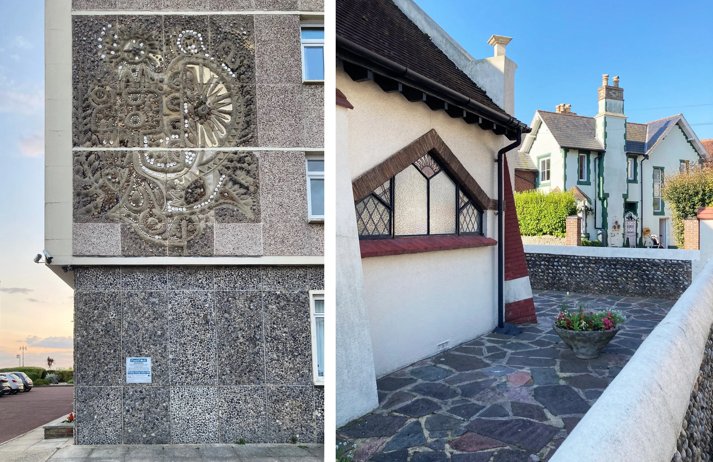 Left: Pebble mosaic on the end of Dolphin Lodge. Right: side windows and walls of Worthing Spiritualist Church.