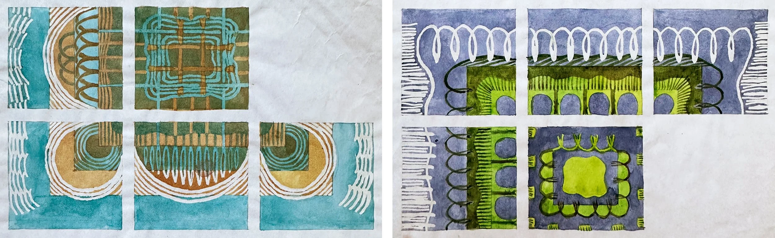 Back in the studio I found the watercolour designs, tiny but close in feel to the final product. I’m now thinking of how much I can learn from looking back at the way I used to do things before computer technology intervened in the drawing up process and everyone’s work started looking slightly similar.