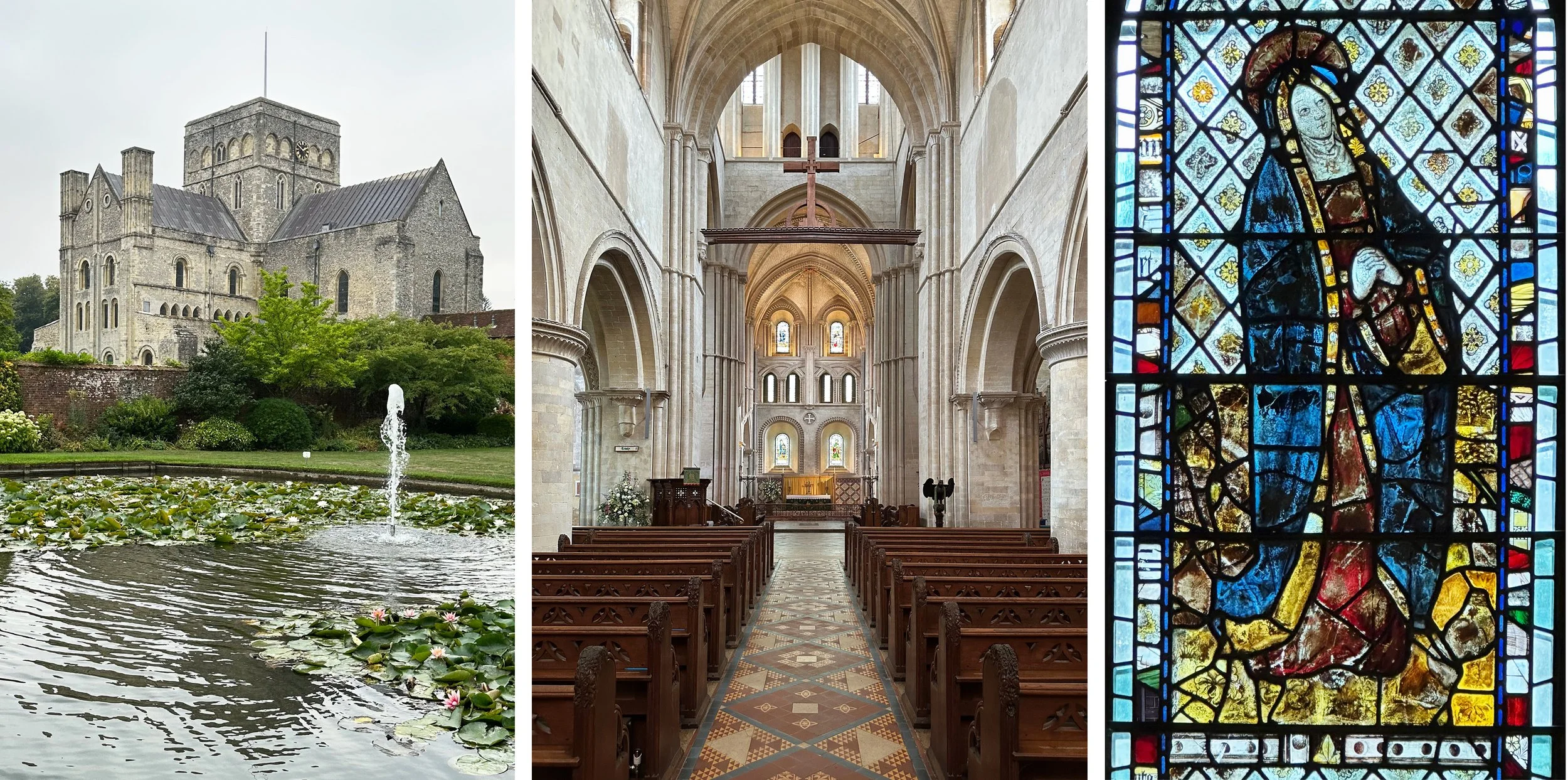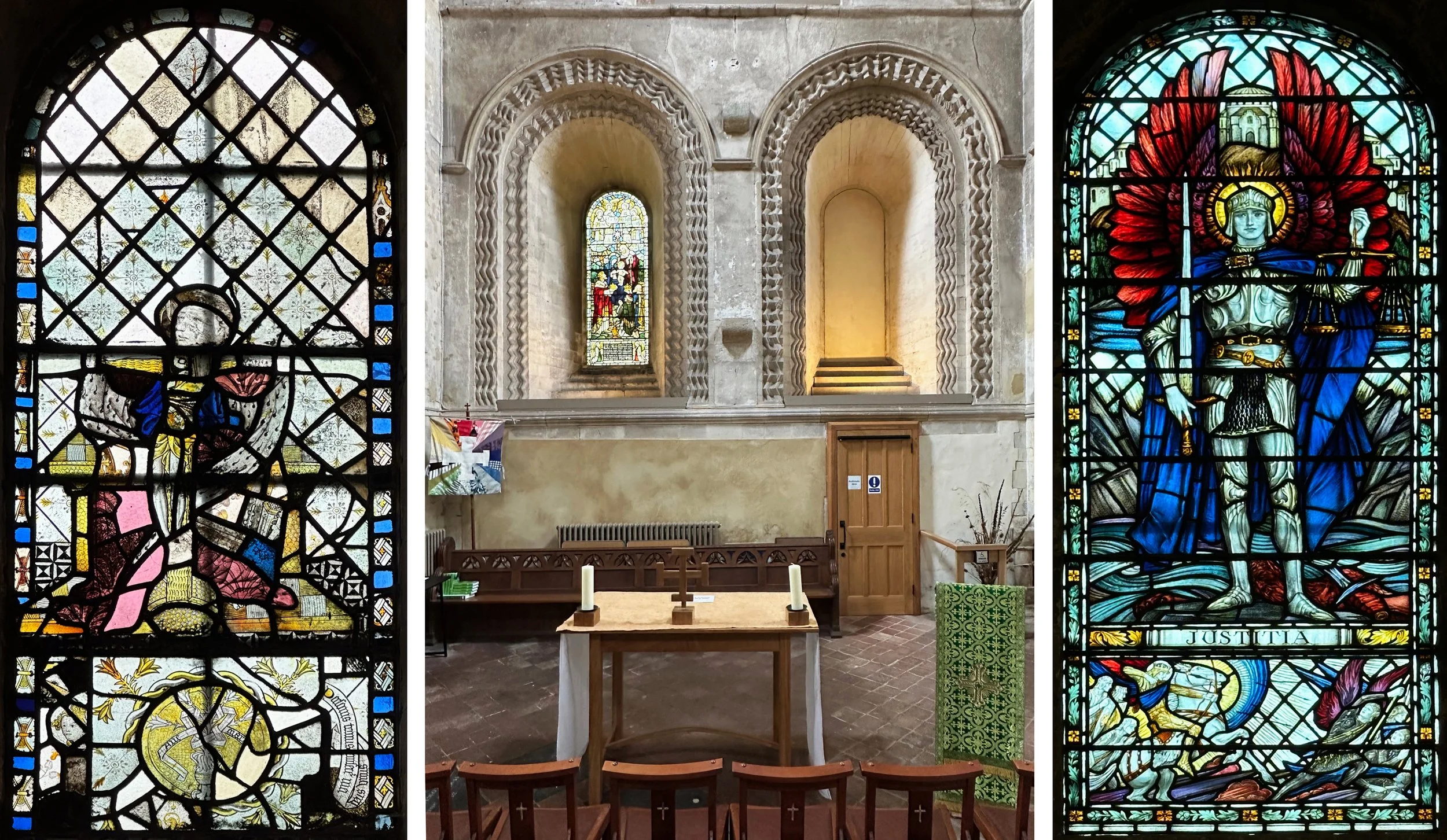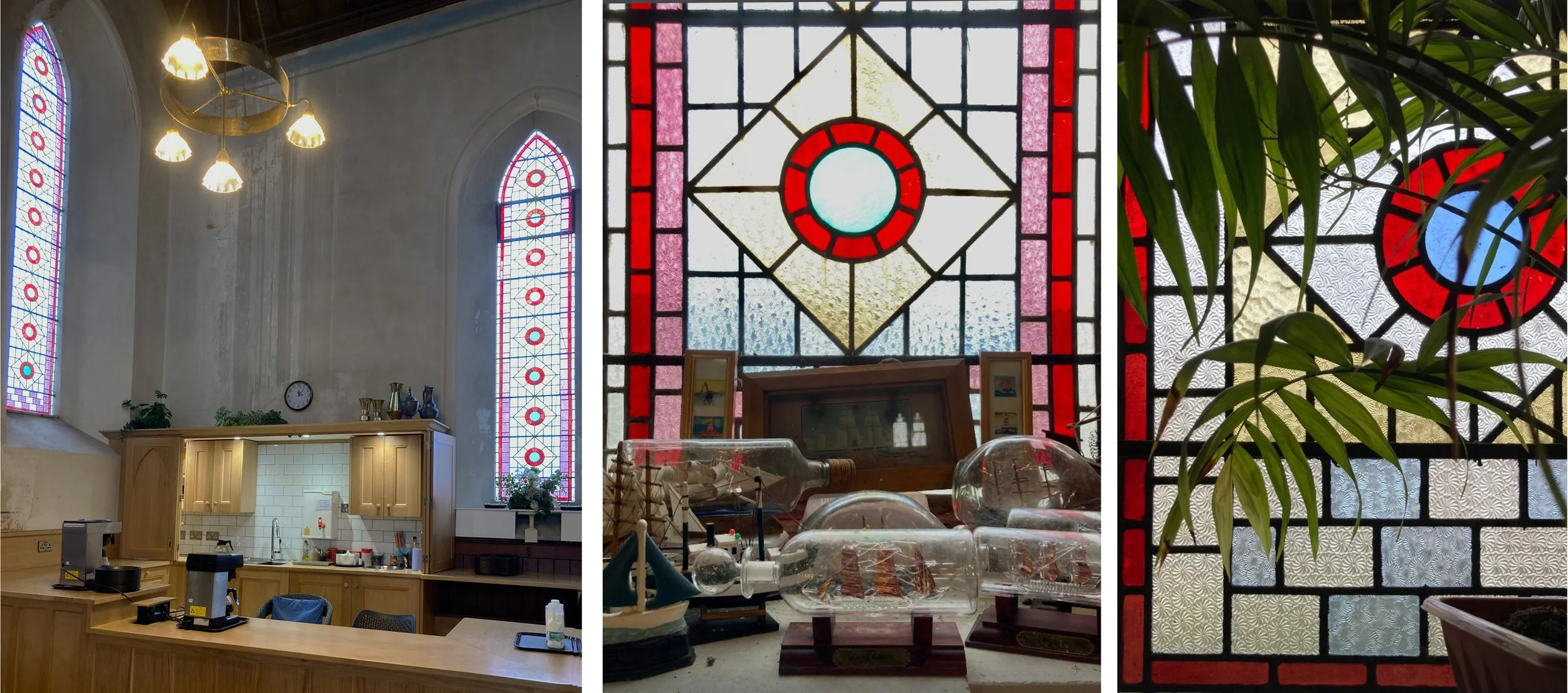 Christ Church is close to the town centre and often open, as you can see below it’s a nice place to have coffee. There is stained glass from the late nineteenth century and also a whole series of decorative windows in two different colour combinations of textured glass. The south aisle is known as the fishermen’s gallery, there you can find a great collection of ships in bottles (below centre).