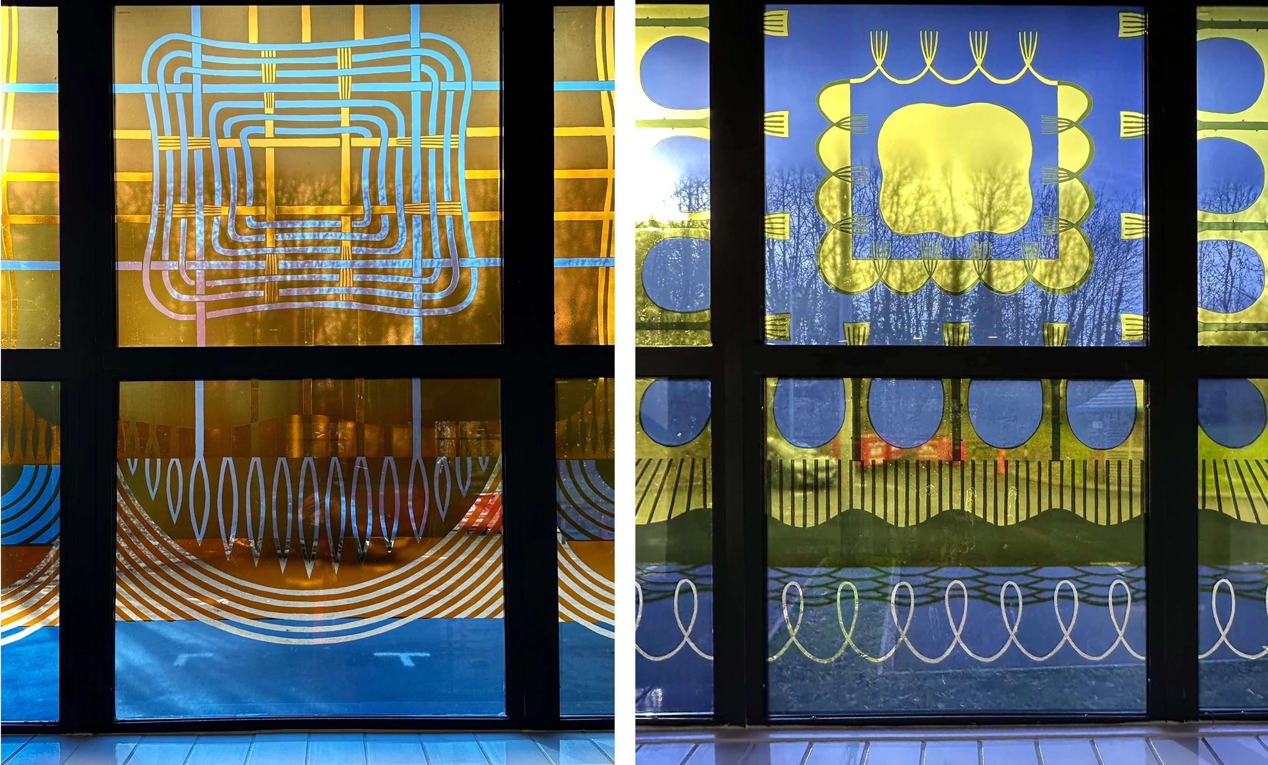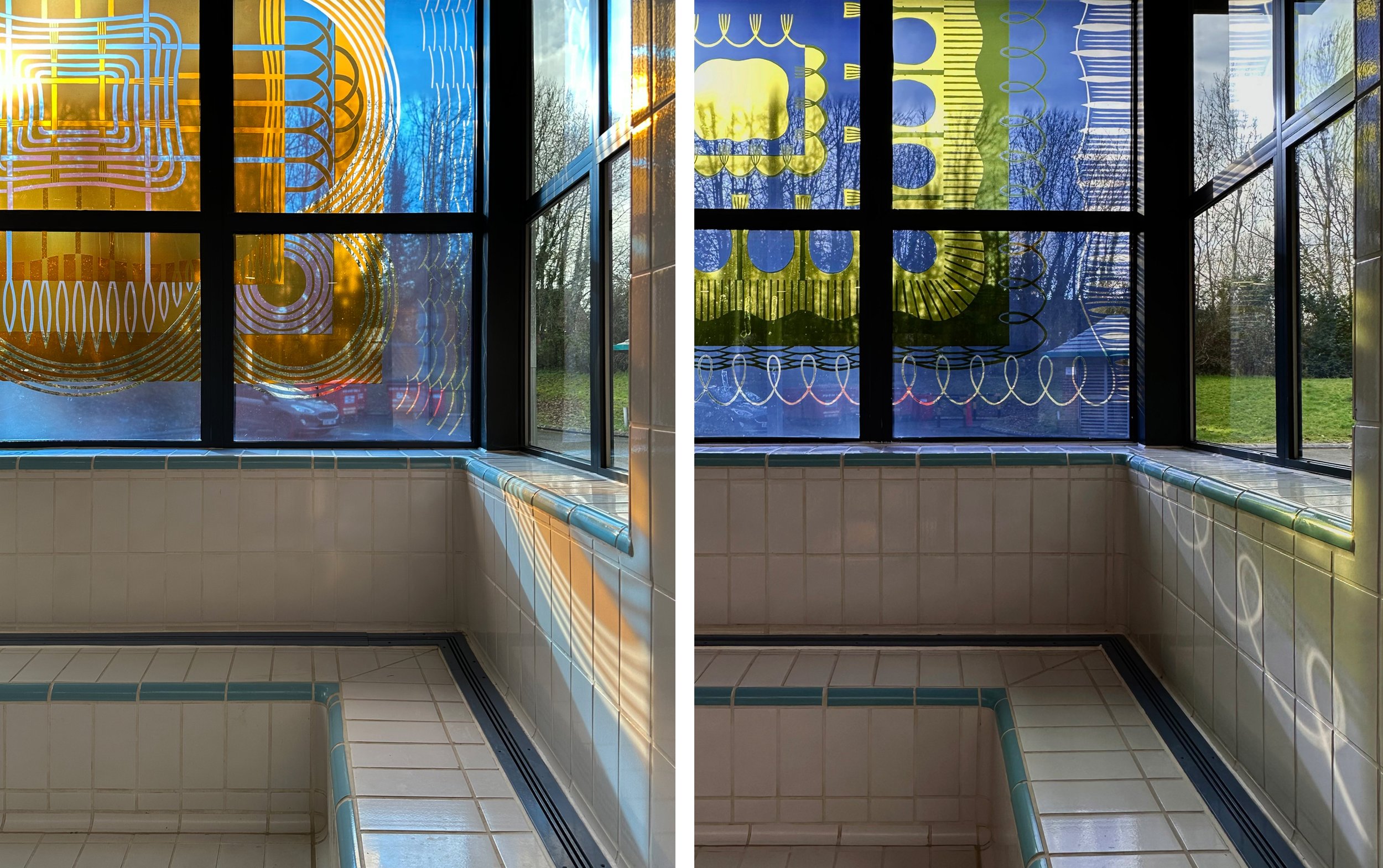 The windows were screen printed at Proto Studios which was located in Greenwich at the time, using old fashioned technology. I drew out the designs in black ink, these were photographed and made into screens resulting in a finish where I can recognise my own hand drawn lines. Each window has a different combination of a blue and a yellow with a third colour on the overlaps and a clear white line rather than a sandblasted white one. The screens for the edge panels were flipped for the panel opposite, making this commission one with a very effective use of a smallish budget.