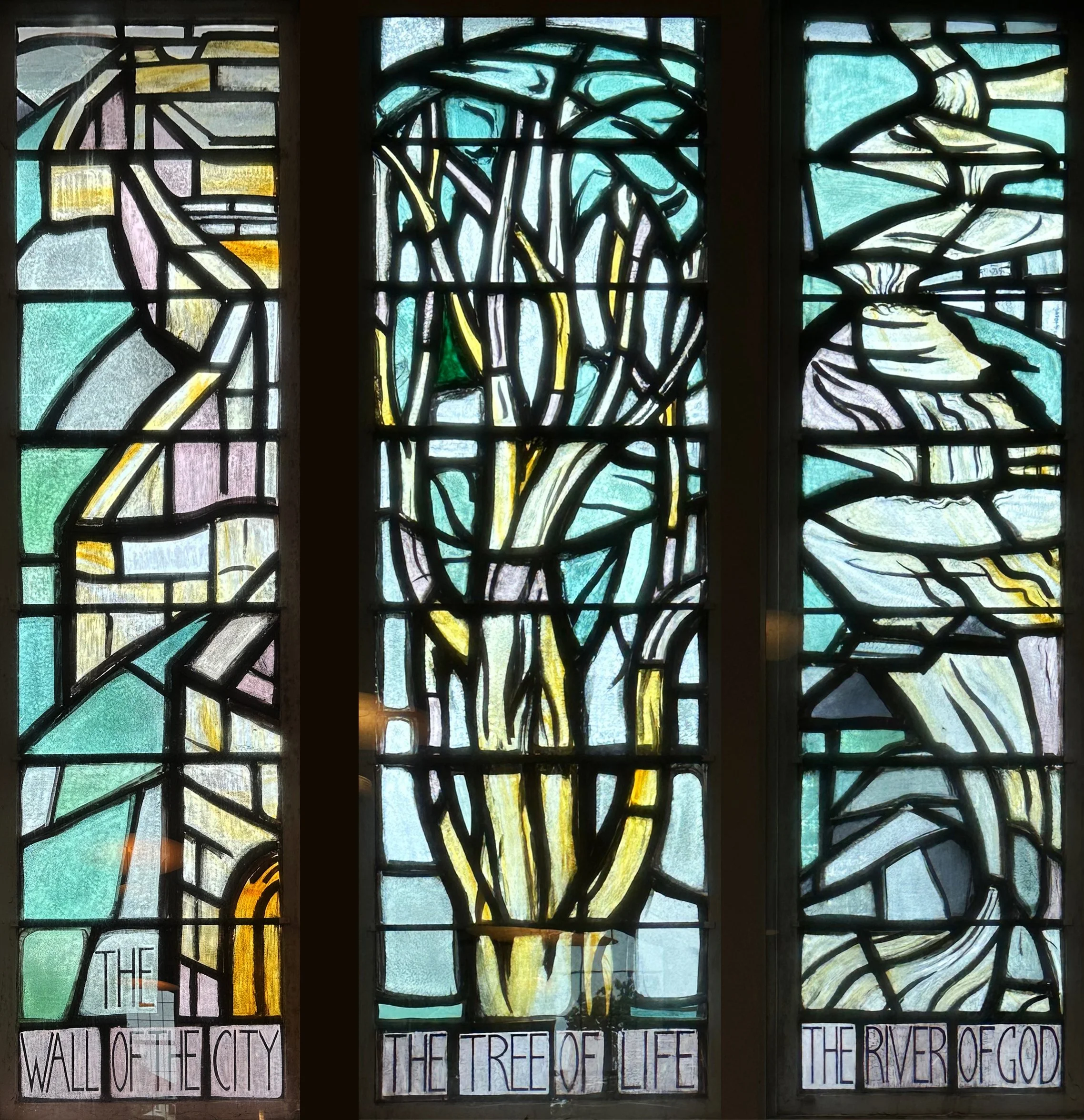 But it has taken me all of these Worthing visiting years to find some stained glass that I find really thrilling. These are three panels, quite big, in Offington Park Methodist Church just north of the town centre. We were invited in to the church for refreshments and to see the new soft play centre installed (in front of a massive stained glass window) in the church hall. Behind a cluttered stage area I saw these Rosemary Rutherford windows, with blinds hanging over some parts and lights shining at them. There is a layer of clear acrylic across the front surface, which protects them but also gives them a flattened appearance as if they are made of tissue paper. They also have a dalle de verre like quality, a medium that Rutherford did use, but here the chunky appearance is the result of thick black painted lines. The windows are powerful but also subtle, with a beautiful colour palette and interpretation of the subject matter - what a great tree and what a great way of fitting a city wall into a tall, thin opening with suitably elongated lettering below.