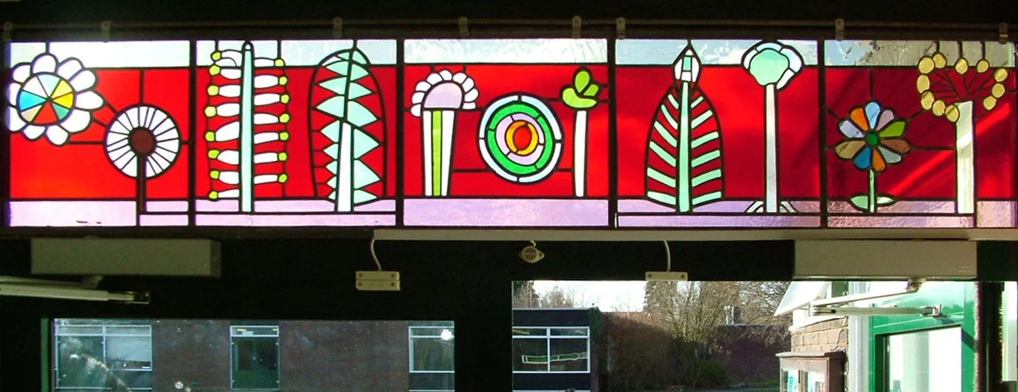 I also remembered the window I made as part of the same public art project in the nearest infants’ school, Bishopswood. The school colour was red and the theme was trees, as it was for the pool windows. The design was directly from eleven of the children’s drawings and I leaded the window up in the school so that the pupils could see how it was made, and handle (health and safety was also great in those days!) the glass pieces. This was a window that I always really liked, hopefully it’s still there too.