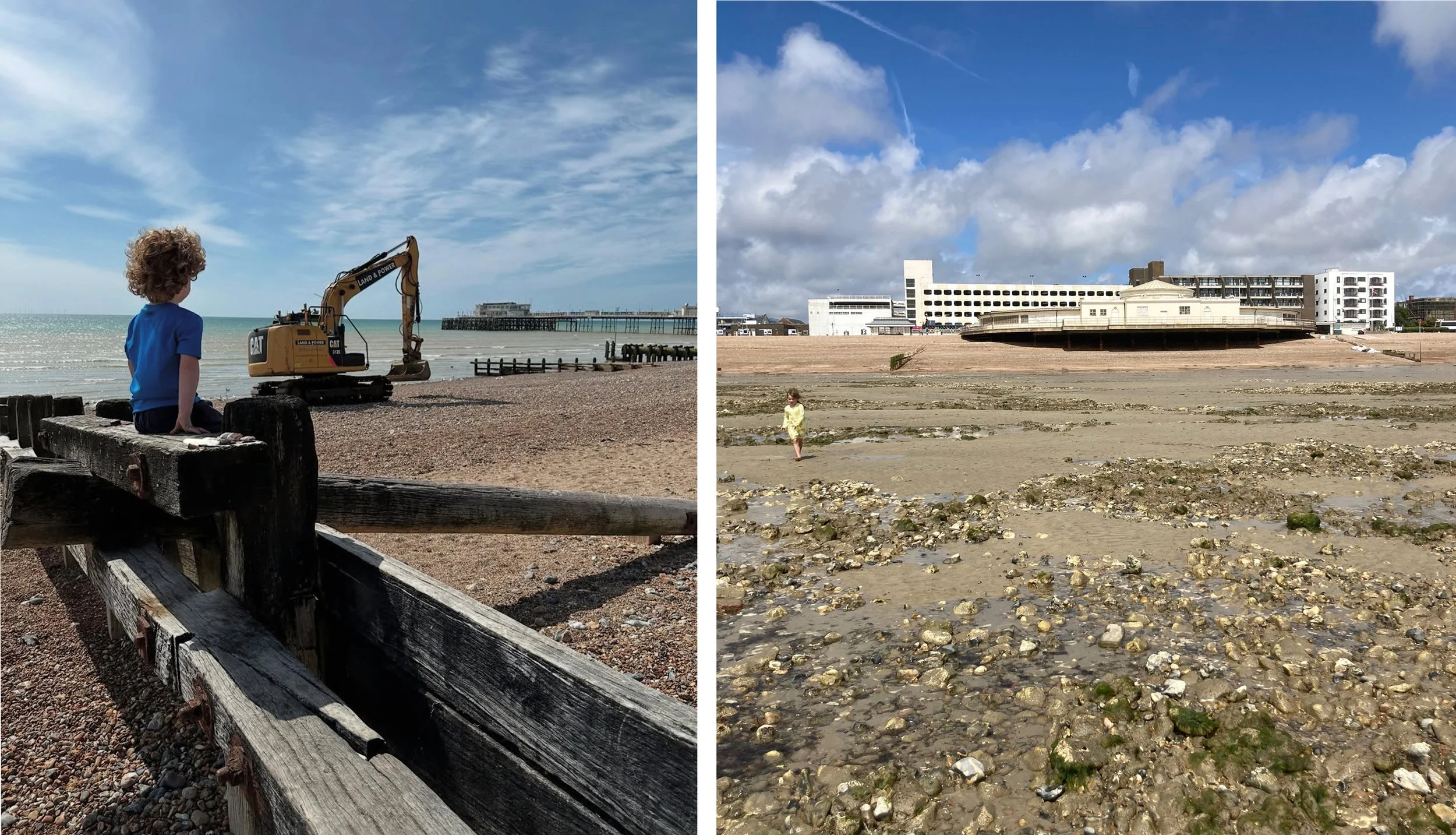 The beach at Worthing with the pier, the former lido and the multi storey car park in the background.