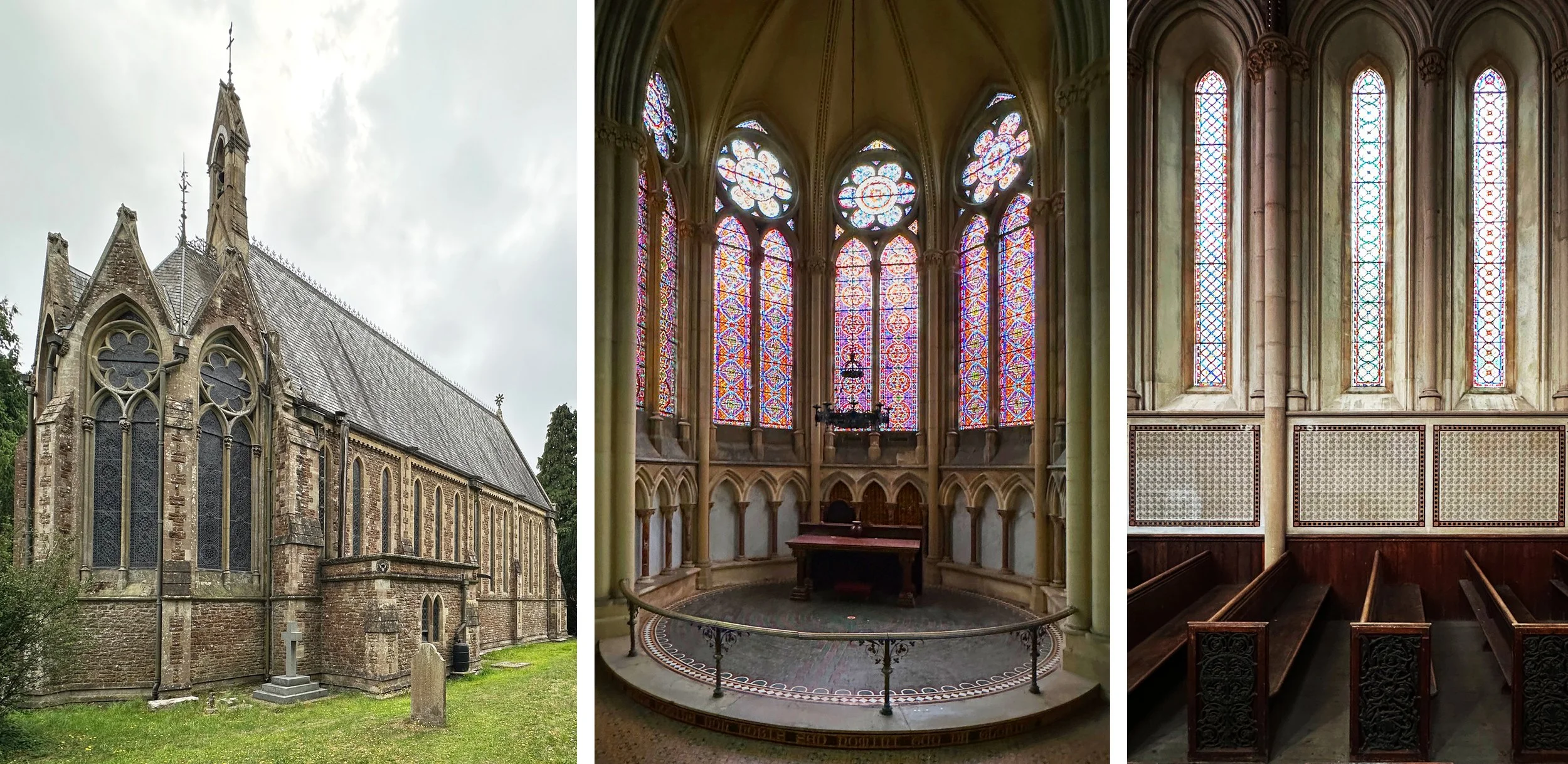 In Shelley Road there are two redundant churches. Holy Trinity (above left) is empty and up for sale, I often look up and imagine how much I would like the west window if I could see it illuminated. It’s listed as a 1979 abstract window by Diana Smart, there are also many Clayton and Bell windows in this church. Panacea Medical Centre (above right) occupies the former United Reformed Church building, it has been smartly converted and it is wonderful to see the stained glass window, by Maile, above the entrance doors lit from inside as the light fades from the beautiful blue sky.